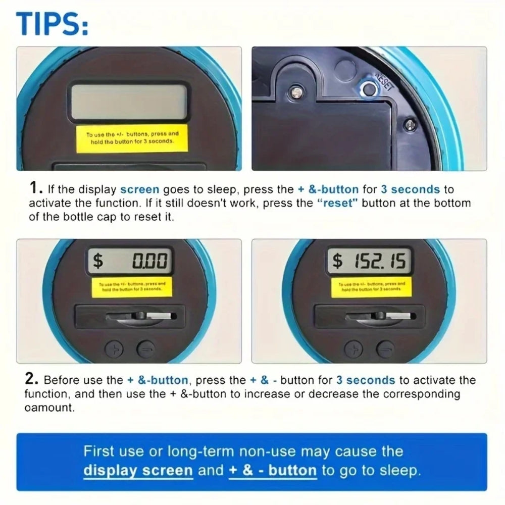Just drop in your coins – the digital counter does the rest! The wide bottle mouth makes coin removal easy, and the twist-off lid ensures hassle-free access. Two side grips make it easy to hold, and the +/- buttons on the lid let you manually adjust the total if needed.