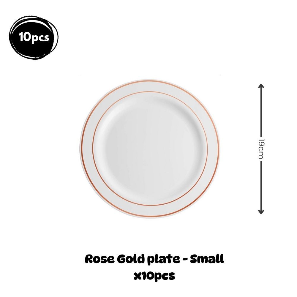 This timeless collection of plastic tableware featuring a sophisticated gold trim design elevates the ambiance of any dining experience.